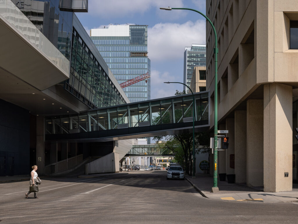 The project involved upgrading two existing City of Winnipeg skywalks on Carlton Street in downtown Winnipeg, Manitoba. One skywalk connects the RBC Convention Centre to the Delta Hotels by Marriott Winnipeg at 185 Carlton Street, while the second connects the Convention Centre to an 18-storey office building at 155 Carlton Street. Together, these skywalks form part of Winnipeg’s elevated, enclosed pedestrian network that links building users to the downtown core.