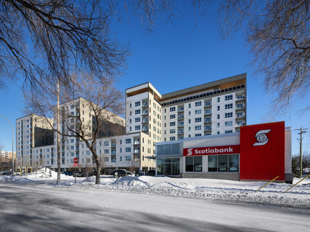 The Scotiabank had originally been located within a strip mall at the centre of the site. To enable the larger development while allowing the bank to remain operational, a new stand-alone building was constructed, permitting the relocation of the bank and unlocking the remainder of the site for residential development.
