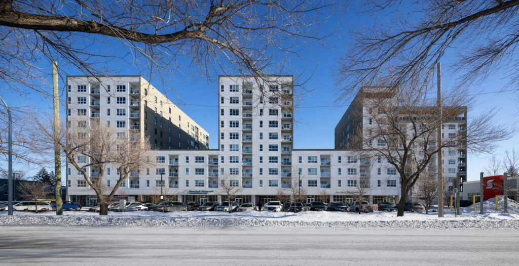 The residential building incorporates approximately 15,000 sq. ft. of ground-floor commercial space, indoor parking at and below grade, indoor bicycle storage, and three residential towers comprising a total of 213 units of varying sizes. Resident amenities include a fitness centre and a multi-purpose room. A distinctive feature of the project is that every residential unit includes a fully recessed balcony, designed to reduce exposure to the surrounding context while functioning as an extension of the interior living space.